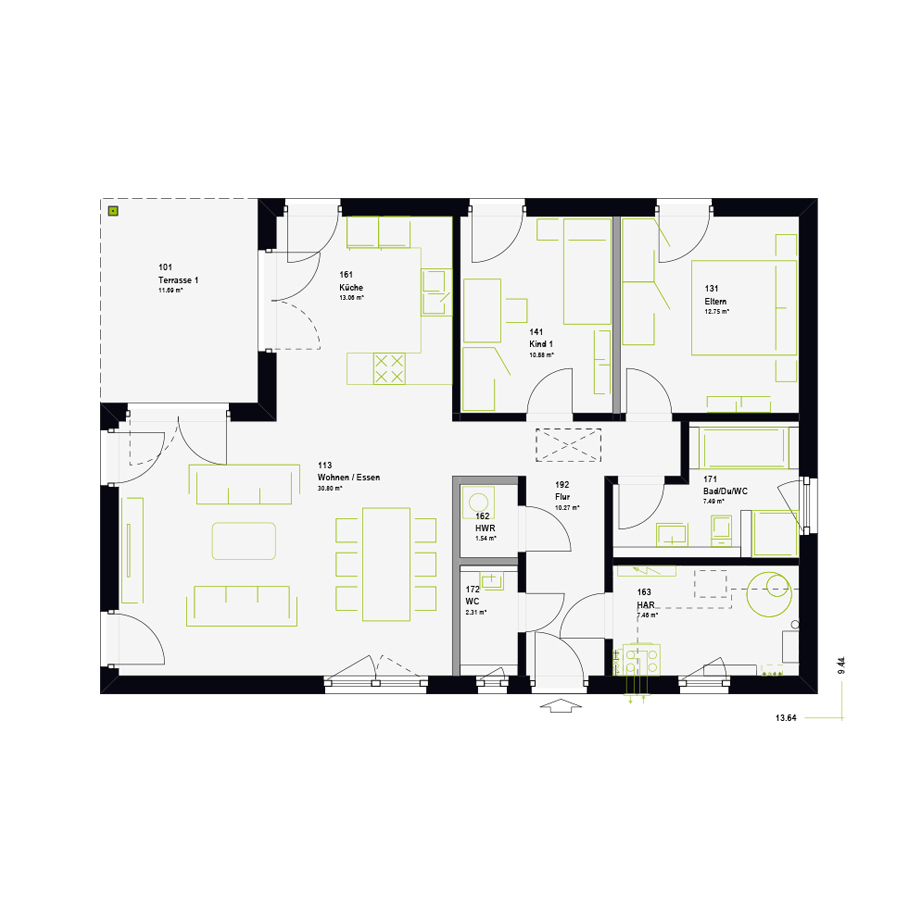 Der Grundriss des ComfortStyle 10.02 P setzt auf Offenheit und Komfort: Der große Wohn- und Essbereich mit direktem Zugang zur Terrasse bildet das Herzstück. Die angrenzende Küche integriert sich nahtlos ins Familienleben. Ein zusätzlicher Raum bietet Flexibilität für Homeoffice oder Gäste. Schlafzimmer, Bad und Hauswirtschaftsraum komplettieren die ebenerdige Wohnfläche.