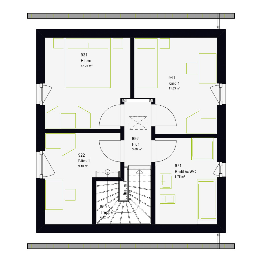 Das LifeStyle 09.02 S ist aufgrund seiner Außenmaße auch für ein kompaktes Grundstück geeignet. Auf 99 m² Nettogrundfläche und mit einer durchdachten Raumaufteilung können du und deine Lieben sich darin frei entfalten. Im Untergeschoss befindet sich der offene Koch-, Ess- und Wohnbereich, im Obergeschoss stehen zwei Schlafzimmer und ein Büro oder Hobbyraum zur Verfügung. Auf Wunsch kannst du das LifeStyle 09.02 S durch Architektur-Upgrades weiter an deine Bedürfnisse anpassen.