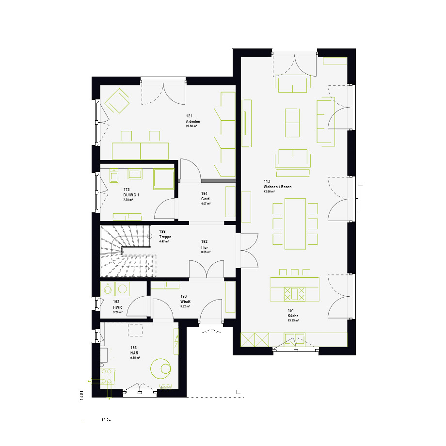 Ein Hightlight sind die großen Fenster im Wohn- und Küchenbereich. Sie lassen Sonne und Licht herein und machen dein massa Haus im Sommer wie im Winter zu etwas ganz Besonderen.