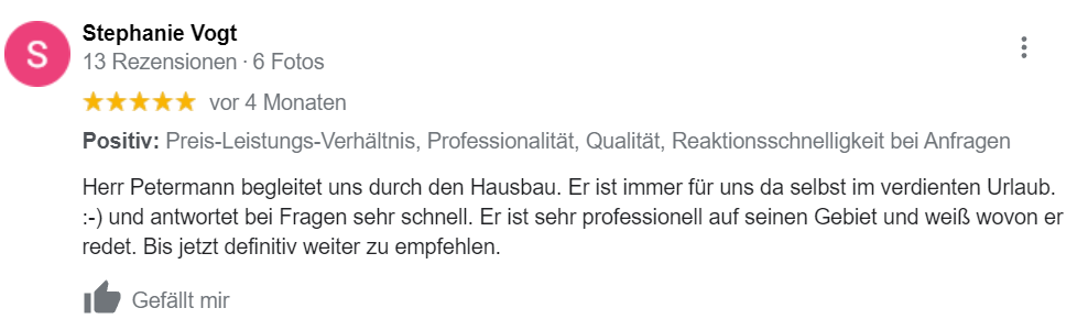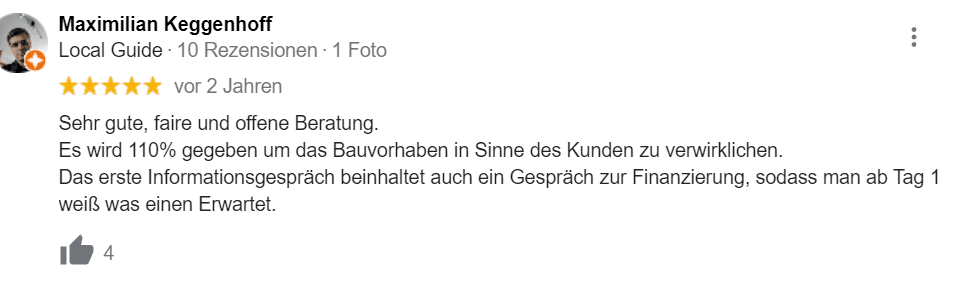Ich begleite dich während des Bauprozesses. Vom ersten Besuch im Musterhaus bis hin zum Einzug in dein neues Zuhause stehe ich dir gerne zur Verfügung. Ich unterstütze dich bei der Wahl des richtigen Haustyps, der Suche nach einem passenden Grundstück und allen Formalitäten.
