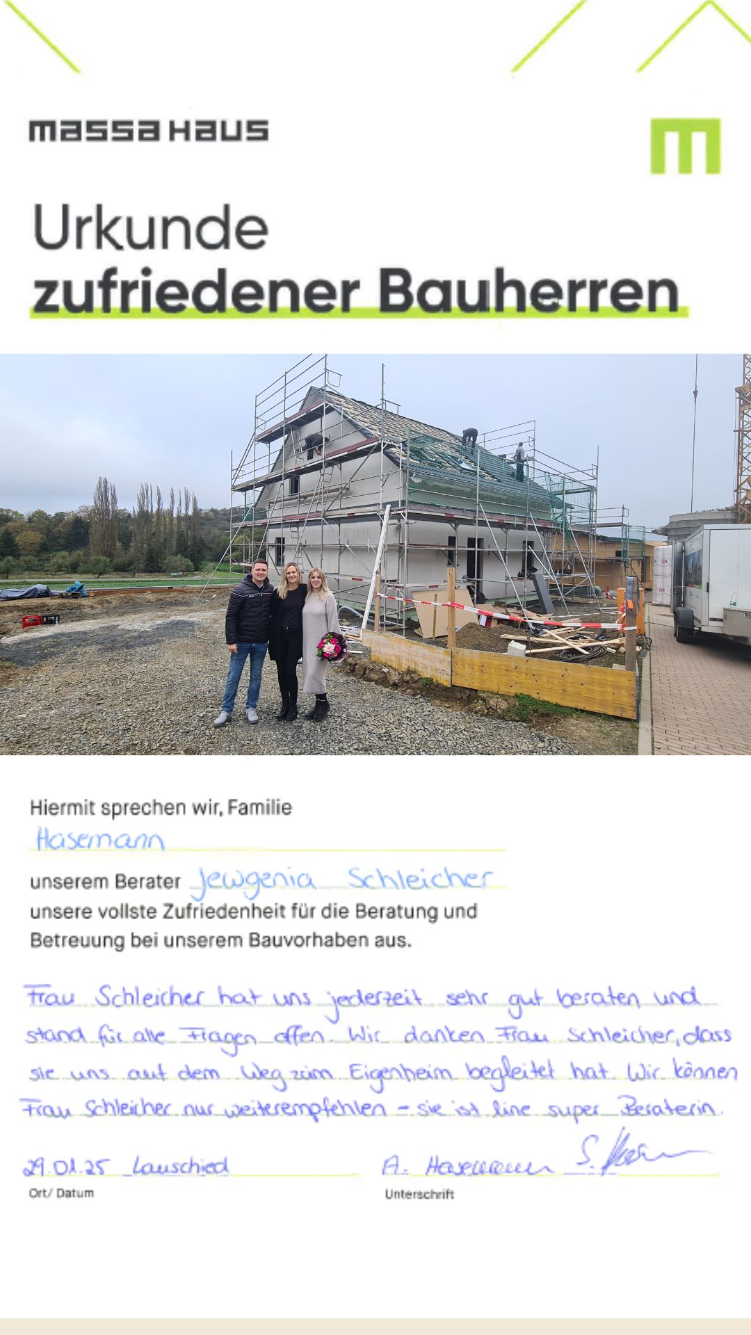 Besuche unser Musterhaus und lerne mich, Jewgenia Schleicher, persönlich kennen. Bei mir erhältst du umfassende Beratung und kannst dir die Qualität eines massa Hauses anschauen. Ich stehe dir zur Seite, beantworte deine Fragen und gebe dir Einblicke sowie Inspirationen.