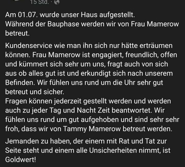Von Anfang an dabei: Wenn du Interesse am Hausbau hast, empfehlen wir einen Besuch bei mir im Musterhaus. Dort kannst du nicht nur die Qualität unserer Häuser erleben, sondern auch mich als deine Beraterin kennenlernen. Mein Name ist Tammy Mamerow, ich berate dich umfassend, gebe dir wertvolle Einblicke und Inspirationen – und begleite dich bei wichtigen Schritten auf dem Weg zum fertigen Eigenheim, beispielsweise bei der Wahl des passenden Haustyps und der Suche nach dem richtigen Grundstück in deiner Region und während des Ausbaus. Ich stehe dir zur Seite, beantworte Fragen vor, während und nach dem Liefertermin.