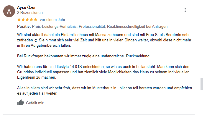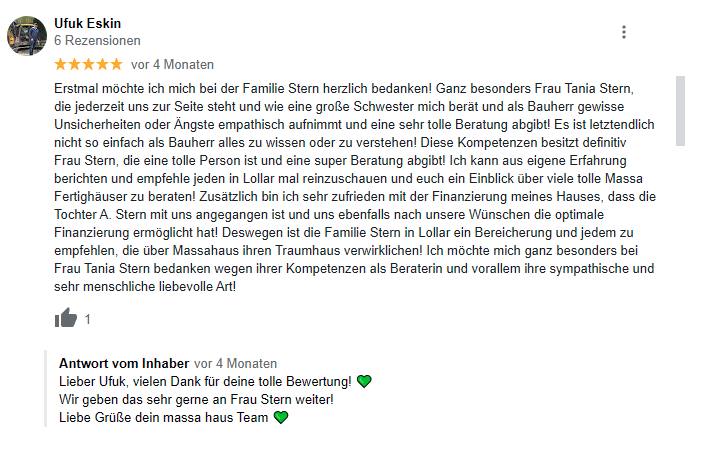 Ich, Tania Stern, begleite dich durch den gesamten Bauprozess. Vom ersten Besuch im Musterhaus bis zum Einzug in dein neues Zuhause stehe ich dir zur Seite. Ich unterstütze dich bei allen Formalitäten und beantworte deine Fragen vor, während und nach dem Liefertermin. Vertraue auf meine Expertise und mach deinen Hausbau zu einem Erfolg. Lass dich von unserem massa Musterhaus Lollar inspirieren und starte dein Bauvorhaben mit einem erfahrenen Partner an deiner Seite. Gemeinsam verwirklichen wir deine Wohnträume.