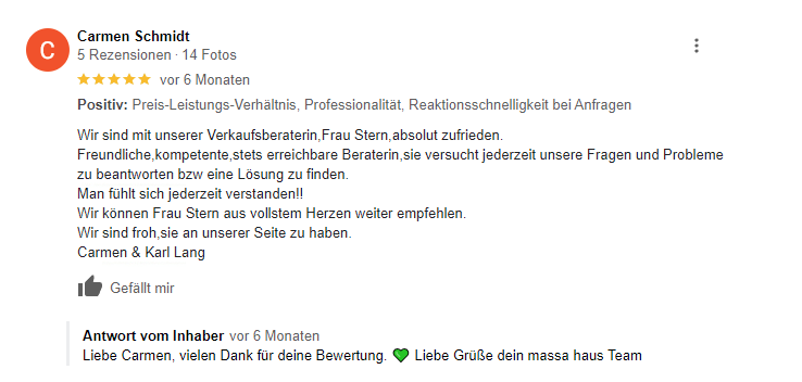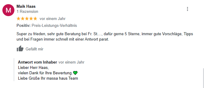 Ein erster Schritt ist der Besuch im Musterhaus. Dort kannst du nicht nur die Qualität unserer Häuser hautnah erleben, sondern auch mich, deine massa haus Verkaufsberaterin kennenlernen. Ich berate dich umfassend und teile Fachwissen und Inspirationen mit dir. Ich helfe dir bei der Entscheidung für den richtigen Haustypen und unterstütze dich bei der Suche nach einem passenden Grundstück. Auch zu Themen wie Nachhaltigkeit, Finanzierung und Förderung kann ich dir wertvolle Tipps geben.